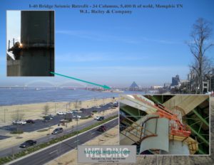Erecting reinforcement steel casings on 34 Bridge Columns ranging from 35′ to 112′ tall amounting to 5400′ of full penetration butt welds